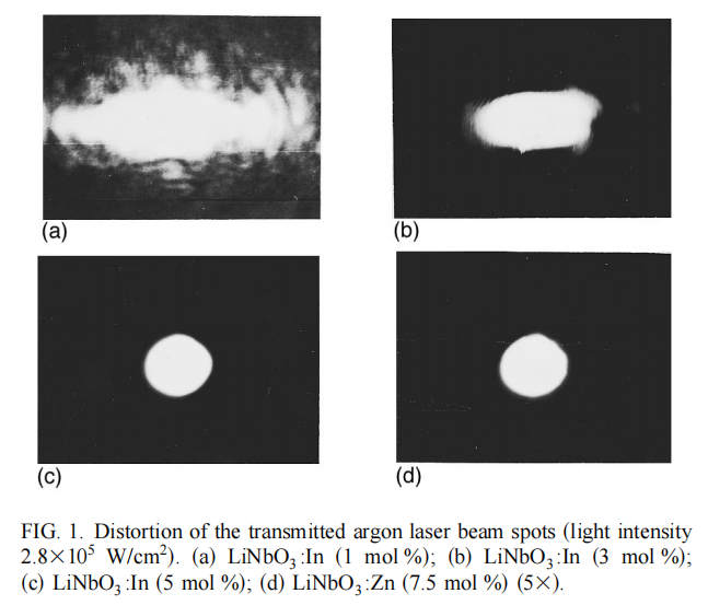 (4)国际上生长首先出抗光损伤性能可与被誉为“中国之星”的高掺镁铌酸锂晶体相媲美的高掺铟铌酸锂晶体,且掺杂阈值低,为抗光折变及全息存储的研究开辟了另一广阔的天地,受到国际同行的重视,并已成为抗光损伤研究领域一个重要的方向,论文目前被他引百余次。