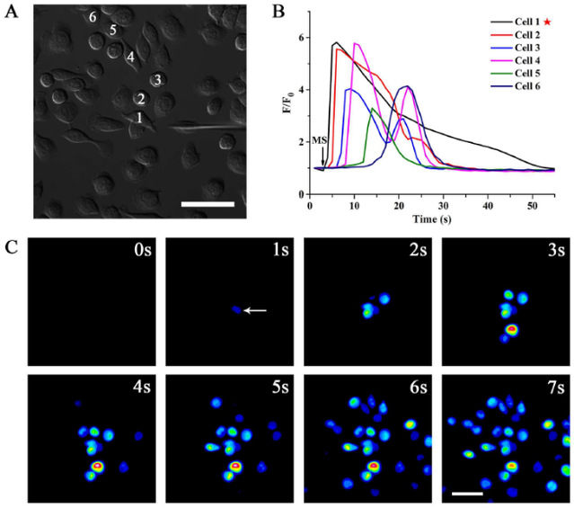 2013年,该研究团队实验发现随机离散的小胶质细胞体系存在明显的自发钙振荡现象,通过单细胞快速荧光成像和理论建模分析,发现胞间通讯介导了此振荡现象(BBRC,2013, 431: 664)。2017年,利用微局域机械力刺激产生单点信号源,在随机离散小胶质细胞体系中观察到胞间钙波传递现象(图1),并基于药理学实验揭示了介导钙波传递信号分子为ATP/ADP,感受信号的膜受体为P2Y12,13(PLo SONE,2017,12: e0183114)。