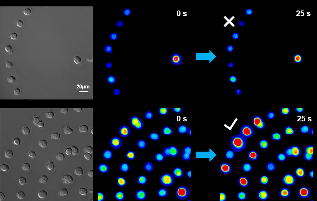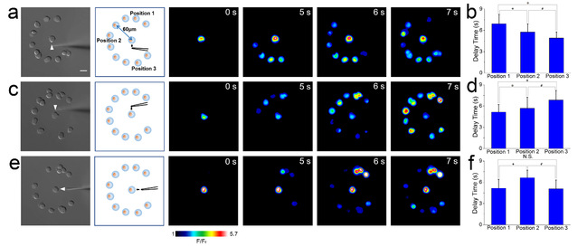 上述常规细胞培养过程中,细胞随机分布于基底,体系参量不可控,只能定性地研究胞间通讯特性。为了实现细胞间通讯模型化、参量可控化的定量研究,研究团队随后引入光刻图案化技术,改善工艺流程,在基底上精准实现小胶质细胞图案化分布控制(图2)。实验结果显示,微局域刺激圆心细胞不同位置,外圈细胞钙波呈现顺时针或逆时针传递,证明介导钙波传递的信使分子分泌具有刺激位置依赖性(图3);设计不同圈数同心圆图案,发现小胶质细胞间钙波传递存在中继站机制,即细胞在感受到信使分子之后自身又会分泌额外的信使分子,扩大了钙波传递的范围并且提高了传播速度和效率(图4),首次实验验证了中继站效应在钙波通讯方面的促进作用;利用椭圆形图案诱导细胞形成片状伪足,发现片状伪足对于信使分子具有更高的敏感性。以上结果可为阐明小胶质细胞快速有效的保护中枢神经系统机制提供新的实验支撑,也为体外研究细胞间通讯特性提供新的实验方案。