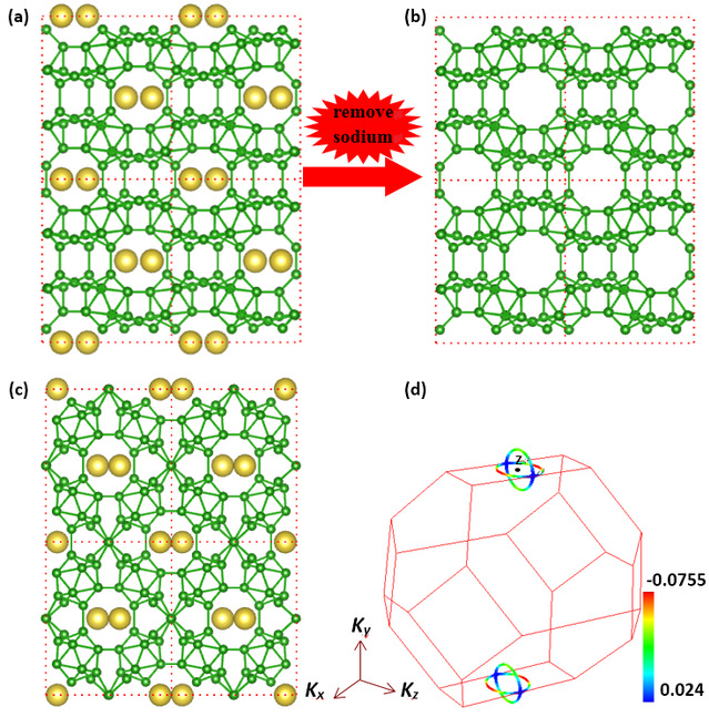 贵金属硼化物是一类具有强耐磨性、抗腐蚀性、耐高温、高硬度的多功能材料,关于贵金属硼化物的研究较为深刻和广泛。碱金属硼化物,作为潜在的新型电池负极材料、储氢或超导材料等也颇受关注。该类化合物的典型代表,钠硼化合物Na2B30或Na2B29早在1969年就被合成,迄今近50年,然而有关它的基态晶体结构和电子性质还存在争议。基于进化算法结构预测软件USPEX的变组分模块,意外发现实验合成的Imma-Na2B30并不是基态结构,而是另一个正交相I212121-Na2B30,两者皆由Na原子,B12团簇和填隙B原子构成。与Imma-Na2B30的三角形填隙硼单元不同,I212121-Na2B30的填隙B原子形成螺旋状硼链。如此细小的结构差别导致XRD或HRTEM很难区分,因为I212121-Na2B30和Imma-Na2B30具有非常接近的晶格常数。有意思的是,细小的结构差别竟然产生完全不同的电子性质。一直以来Imma-Na2B30被视为金属性材料,第一性原理计算发现Imma-Na2B30是拓扑节线半金属。基于紧束缚模型的WannierTools软件显示第一布里渊区有两个正交的nodal rings分别位于kxkz和kykz平面内,受时间-空间反演保护,具有潜在的优越输运性质。与之对比,I212121-Na2B30是具有1.6 eV带隙的间接半导体,根据微观硬度模型,理论Vickers硬度约为37.4GPa,接近超硬材料(> 40GPa)。此外,I212121-Na2B30的三维硼网格具有开放式骨架结构,Na原子位于沿[010]晶向的特殊通道中,若I212121-Na2B30被实验合成,通过退火蒸发Na原子的办法,有望获得新型亚稳单质硼(B30)。