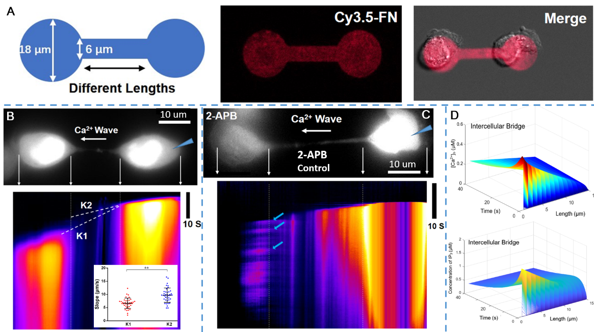 正常基底上形成的细胞间桥只有几微米长,且存在时间较短,方向不定,难以可控、定量的研究细胞间桥介导的钙波传递。为此,课题组基于光刻图案化技术设计制作了哑铃状图案来控制BV-2小胶质细胞的分裂,诱导其子细胞之间形成长度达十几微米、存在时间达数十分钟的细胞间桥(图1A)。借助于这种大尺寸且较稳定存在的细胞间桥,我们使用微局域机械力刺激其中一个子细胞引发钙动员使得另外一个子细胞发生钙动员(图1B),发现细胞间桥既可以介导钙离子自由扩散通过,也可以介导IP3依赖的钙库释放,且钙离子的自由扩散速度(K2)大于IP3依赖的钙库释放速度(K1)。当钙释放途径被IP3受体抑制剂阻断后,钙离子在细胞间桥中的被动扩散可被直观的观察(图1C)。此外,我们还基于扩散方程对钙离子和IP3在细胞间桥中的扩散行为以及二者在两个子细胞中的浓度变化进行了数值模拟,结果与实验相吻合(图1D)。综上,借助细胞光刻图案化技术,课题组首次揭示了细胞间桥可通过钙离子自由扩散和IP3信号途径两种方式介导有丝分裂末期子细胞之间钙波通讯,为研究钙信号在狭长结构中的传递行为提供了新的实验方案和数据支撑。