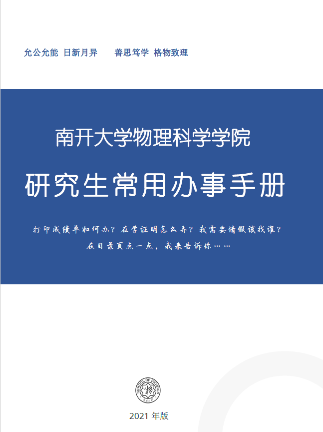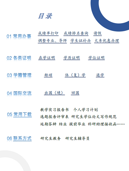 打开《研究生常用办事手册》(简称小蓝册),在目录页点一点,我来告诉你……