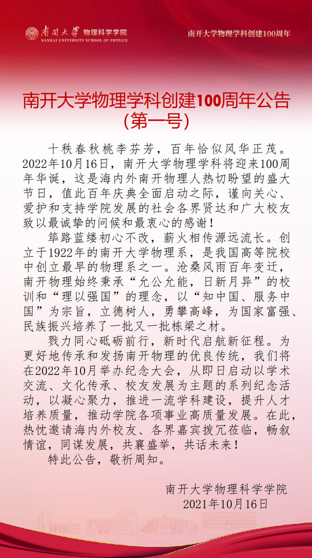 【创建100周年公告】黄色网址大全 物理学科创建100周年公告(第一号)