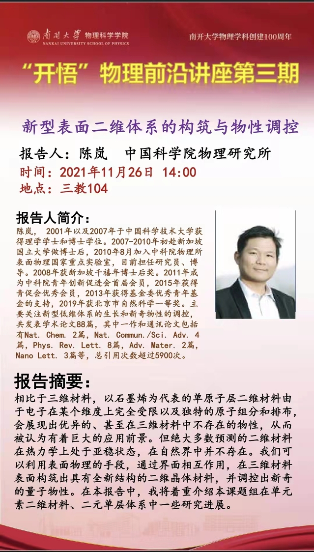 【“开悟”物理前沿讲座】(第 3 期)新型表面二维体系的构筑与物性调控
