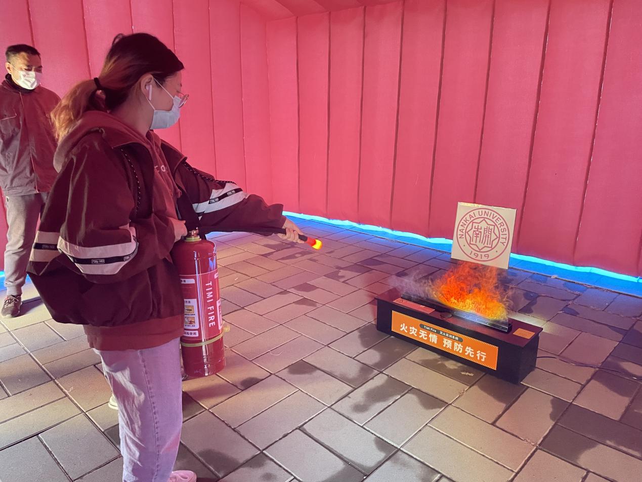 灭火体验帐篷内部模拟初期火灾。学生通过实际操作“灭火器”化身“消防员”,向火焰根部“喷洒”救火,直至火源扑灭。