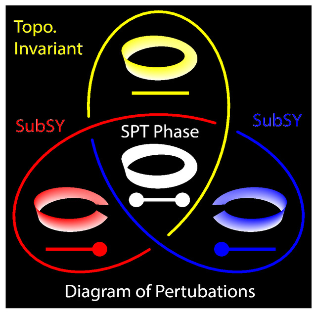 图1 对称性保护的拓扑相(SPT phase)中关于扰动的分类示意图。黄线区域代表一组满足特定对称性的扰动,并不破坏整体系统的拓扑不变量(Topo.Invariant)。每个边界态都受到其相关的子对称(SubSy)的保护,其中红线和蓝线区域分别代表两组满足子对称的扰动,此时扰动破坏了整体系统的拓扑不变量,但不影响子对称保护的边界态; 重叠区域代表的拓扑相同时具有拓扑不变量以及相应的拓扑边界态。