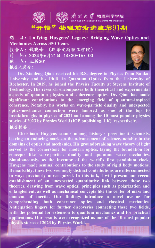 【“开悟”物理前沿讲座 (第91期)】Unifying Huygens' Legacy:Bridging Wave Optics and Mechanics Across 350 Years
