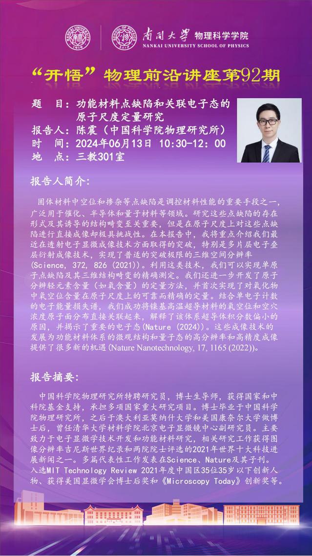 【“开悟”物理前沿讲座 (第92期)】功能材料点缺陷和关联电子态的原子尺度定量研究