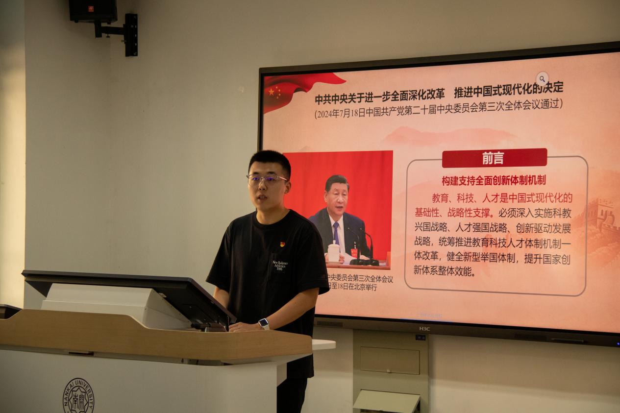 活动中,黄色网址大全 黄色网址大全 博士第一党支部书记朱鹏飞进行了题为《党的二十届三中全会:推进教育科技人才体制机制改革》的报告,带领与会成员学习了党的二十届三中全会在深化教育综合改革、深化科技体制改革、深化人才发展体制机制改革这三个方面做出的重要部署。