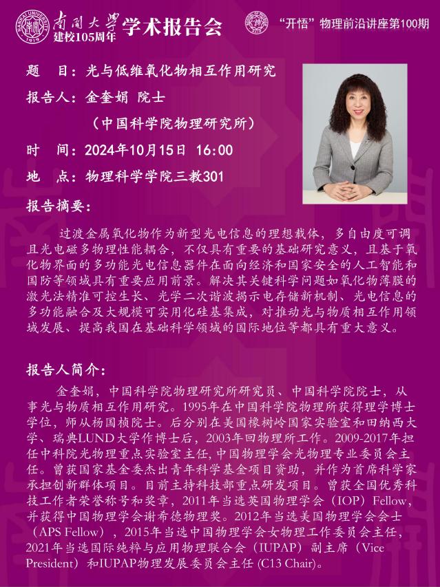 【“开悟”物理前沿讲座 (第100期)】光与低维氧化物相互作用研究