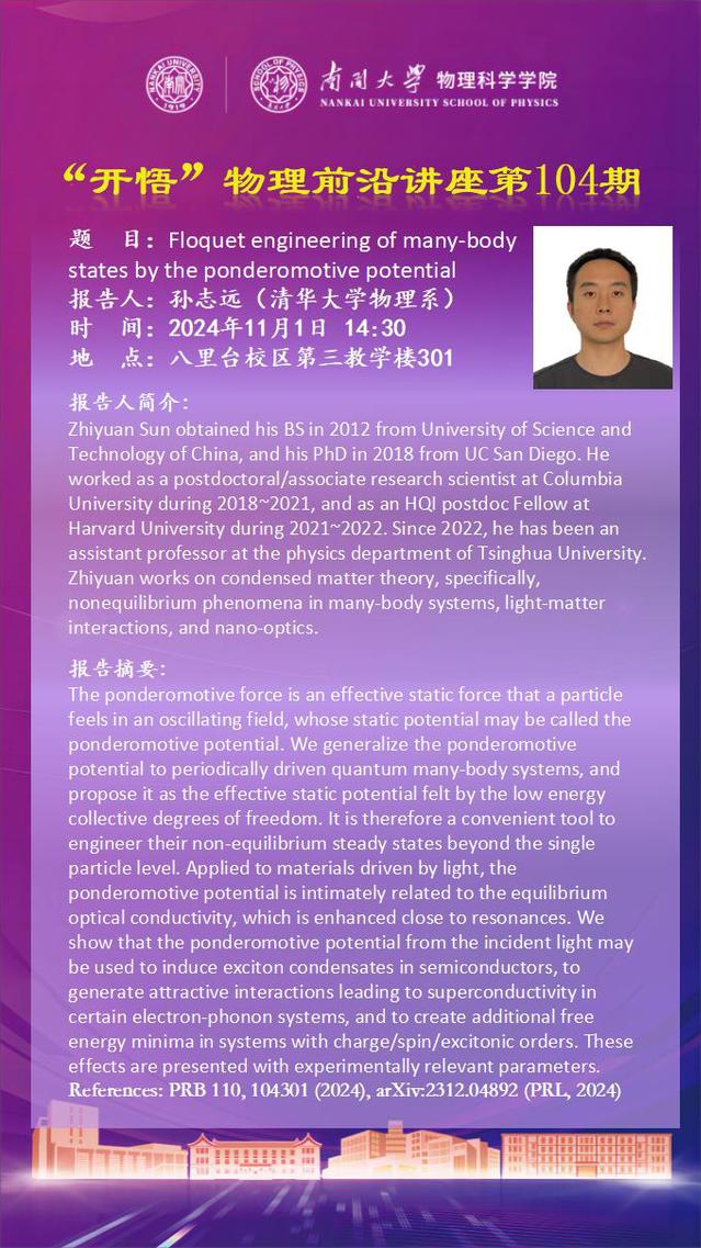 【“开悟”物理前沿讲座 (第104期)】Floquet engineering of many-body states by the ponderomotive potential