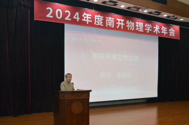院长张国权进行学院2024年工作总结和2025年工作部署。提到,2024年学院坚持以习近平新时代中国特色社会主义思想为指导,全面深入学习贯彻党的二十届三中全会精神和全国教育大会精神,以贯彻落实习近平总书记来校视察重要讲话精神为纲,坚持立德树人根本任务,一心一意搞建设,聚精会神谋发展,一年来在全体师生的共同努力下,学院在党建思政、教学改革、学生培养、人才引育、科研创新、平台建设以及国际交流等方面均取得新进展。大会认真总结了过去一年取得的新成果,详细分析了目前发展面临的困境和难点,重点传达了下一步重要任务和中心工作。强调,在南开物理新百年事业发展中,学院每一个人都是主角,每一份付出都弥足珍贵,每一束光芒都熠熠生辉,呼吁满怀希望,同心协力,共创美好未来。