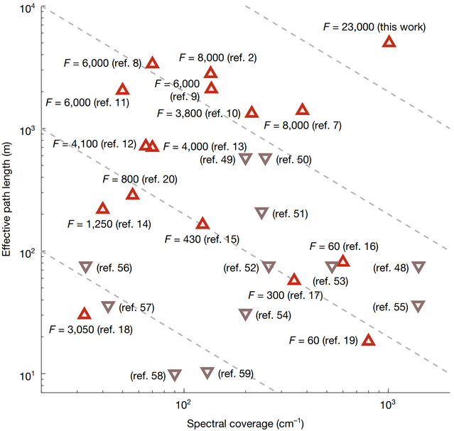 气体成份表征广泛应用于工业生产、气候变化、生物医疗等多个领域。不同分子对不同激光波长的吸收信号强度各异。通过产生宽带激光并确保分子对光吸收的超长距离,可以实现对不同分子种类的超高灵敏度探测。在该研究中,梁启忠及其合作者展示了一项技术,能够覆盖高达1,000 cm⁻¹的超宽带激光波数范围,并实现长达5 km的等效分子光吸收距离。该工作展示了对复杂气体中多达20种分子的同时探测,对不同分子种类的成份表征跨越了七个浓度数量级。