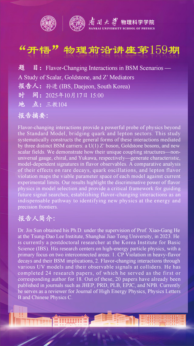 【“开悟” 物理前沿讲座 (第159期)】Flavor-Changing Interactions in BSM Scenarios — A Study of Scalar, Goldstone, and Z′ Mediators