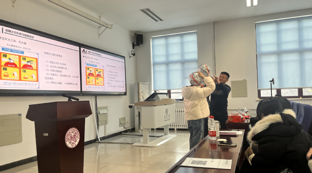培训中,陶鹏宇主任立足高校消防安全管理核心要求,结合多起典型火灾事故案例,全程以科研视角围绕理论知识、案例警示、管理实践、技能实操等六个方面展开讲解。首先,夯实消防安全基础知识,明确火灾分类、燃烧三要素等核心概念,筑牢安全知识理论根基;其次,通过还原高校实验室、教学楼等场景的典型火灾事故案例,深入剖析电路老化、气体泄漏、试剂存放不当、违规操作等火灾成因,以真实案例强化警示效果;随后,聚焦校园消防安全管理体系建设,重点解读《中华人民共和国消防法》《高等学校实验室消防安全管理规范》等相关法规核心条款,明确高校、师生在消防安全工作中的责任与义务;在此基础上,系统梳理校园及实验室常见火灾隐患的排查标准与方法,指导师生精准识别身边安全风险点;最后,通过图文并茂的演示与现场实操教学,详细传授初期火灾扑救技巧(包括灭火器“提、拔、握、压”操作规范、消防栓使用流程)与疏散逃生自救规范(如弯腰低姿行进、湿巾捂鼻防烟、安全通道优先选择等),并针对突发火情的报警流程、人员疏散、风险隔离等应急处置关键环节进行专项指导,确保师生既能“懂安全”,更能“会安全”。互动环节中,陶主任现场演示消防器材操作要领,耐心解答师生疑问,让大家在实践中加深对消防知识的理解与运用。