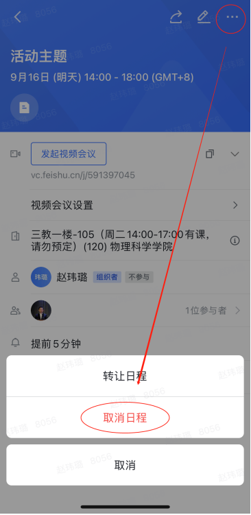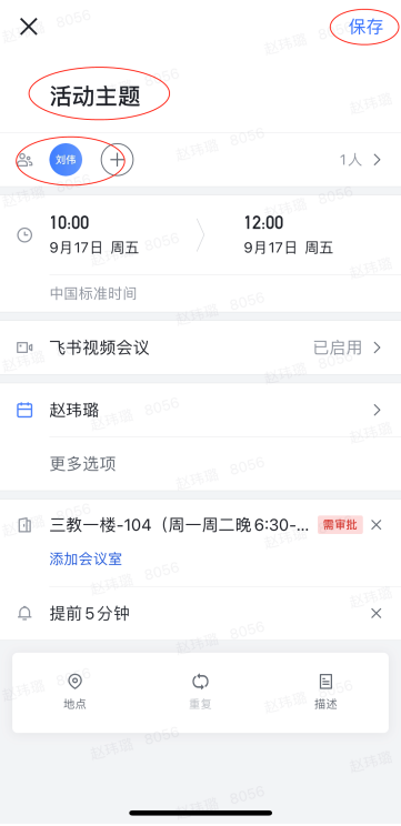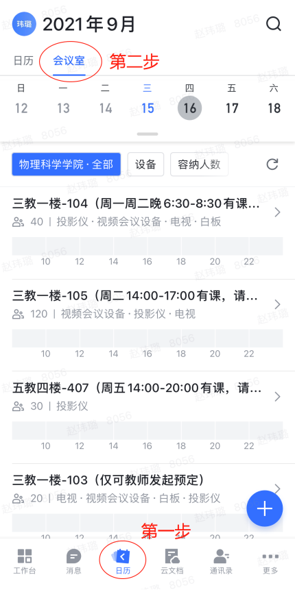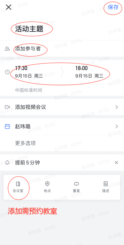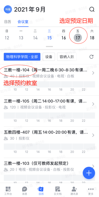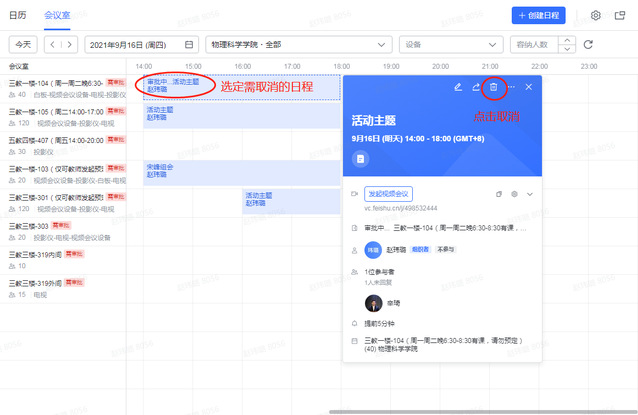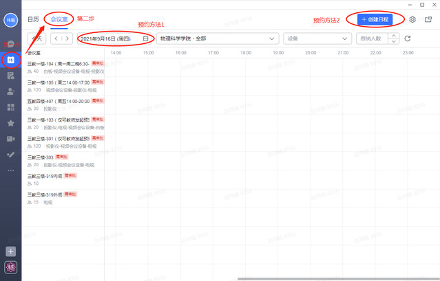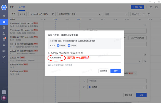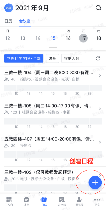 或点击右下角“创建日程”→填写活定主题、时间、联系人等信息,添加需预约教室→保存提交→等待审批