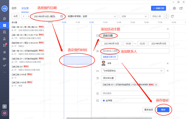 选择预约日期→选定预约时间→填写活动主题,添加联系人等信息→保存提交→等待审批