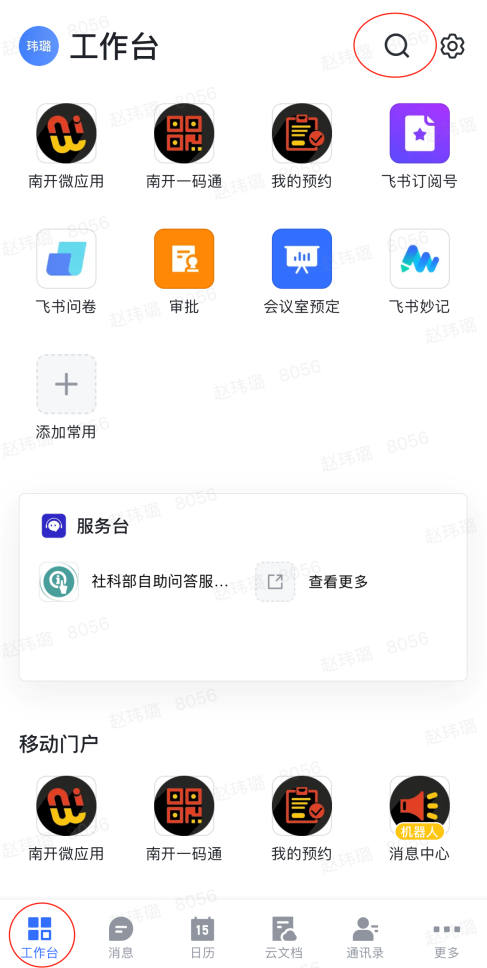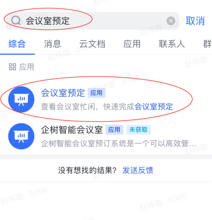 工作台搜索“会议室预定小程序”,可快捷跳转至会议室预定界面