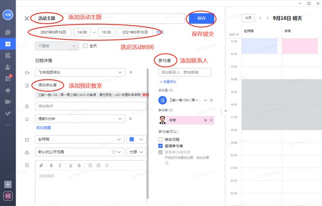或点击右上角“创建日程”→填写活定主题、时间、教室、联系人等信息→保存提交→等待审批