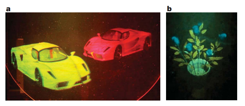 (2)激光显示被认为是继黑白显示、彩色显示、数字显示之后的新一代显示技术,被称为“人类视觉史上的革命”,具有色域范围广、寿命长、节环保等特点。在红、绿、蓝三基色激光中,目前红光和蓝光已经解决,但绿光技术还不成熟,而通过周期极化掺镁铌酸锂晶体倍频获得绿光是一种可行的方案。裸眼立体显示一直被公认为显示技术发展的终极梦想,多年来有许多企业和研究机构从事这方面的研究。现已开发出佩戴立体眼镜的立体显示技术,不需佩戴立体眼镜的立体显示技术体系也在研发中。通过全息技术再现立体图像是一种不需要显示器的立体显示技术,能够真正给人身临其境的感觉。铌酸锂晶体作为常用的全息存储材料是可选择的材料之一。