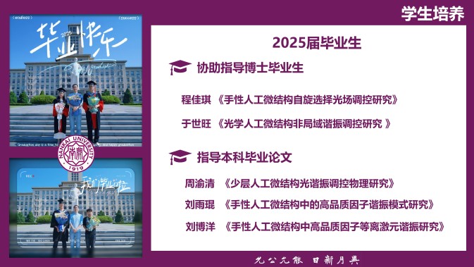 荣誉称号 金奖银奖都不如学生的夸奖 2024 天津市自然科学一等奖 (4/5) 2020 《物理实验》创刊40周年百篇优秀论文奖 2019 黄色网址大全 优秀博士学位论文 2018 黄色网址大全