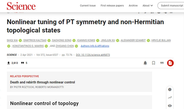 The research group led by professor Zhigang Chen and professor Jingjun Xu from the School of Physics of Nankai University and TEDA Institute of Applied Physics, with cooperation with research groups from University of Zagreb in Croatia, University of Crete in Greece and University of Rostock in Germany, established a nonlinear non-Hermitian topological photonics platform for the first time in the world. Thus, the manipulation of parity-time symmetry and non-Hermitian topological states in an optical system can be realized by using nonlinearity. The research team also found the antagonistic effects on the sensitivity and robustness of topological states in non-Hermitian systems when close to the exceptional point that determines the breakdown of the PT symmetry. The team also discovered the control principle of the overall PT symmetry of the system through local nonlinearity. This innovation brings about new insight towardsnonlinear effects in the open topological systems while pioneering a new perspective for the research of nonlinear topological photonics and its related frontier fields. Entitled Nonlinear tuning of PT symmetry and non-Hermitian topological states, the research result was recently published in the prestigious journal Science.