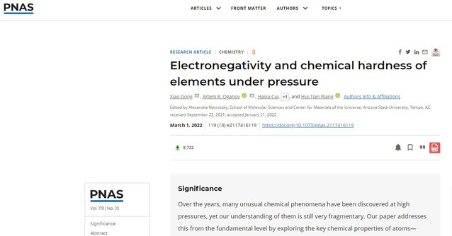 Various experiment results have indicated that the periodic law of elements would undergo variations under high pressure, which is also a breakthrough for the study of physical and chemical laws under high pressure. The research group led by Associate Professor Xiao Dong from the School of Physics of Nankai University, in cooperation with the research group led by Professor Artem R. Oganov from Skolkovo Institute of Science and Technology in Russia, and other collaborators, have spent nearly ten years studying the variation trends of the chemical properties of the elements under pressure. Their project has recently published as a research paper titled Electronegativity and Chemical Hardness of Elements under Pressure on the PNAS (Proc Natl Aca. Sci 119, 2117416119 (2022)).