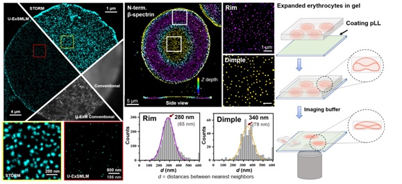 To sum up, the present work proposed a strategy for the combination of SMLM and ExM relied on poly-l-lysine adhering. The developed method of U-ExSMLM reached the molecular resolution of ~6 nm, and directly revealed the asymmetry of the erythrocyte cytoskeleton, providing a molecular explanation for understanding the unique biconcave morphology and shape memory phenomenon in human erythrocytes.