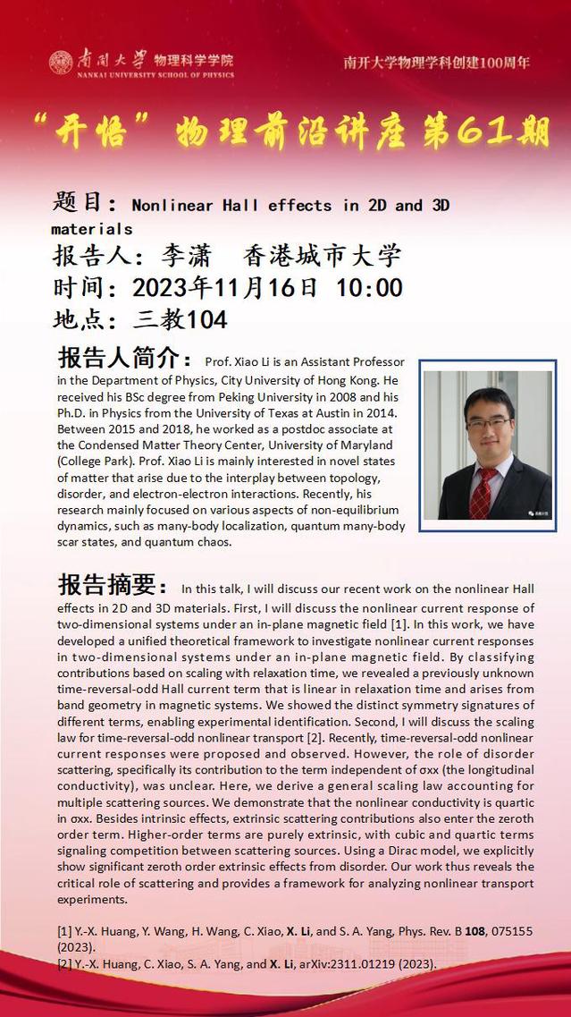 Kaiwu Lecture 61: Nonlinear Hall effects in 2D and 3D materials